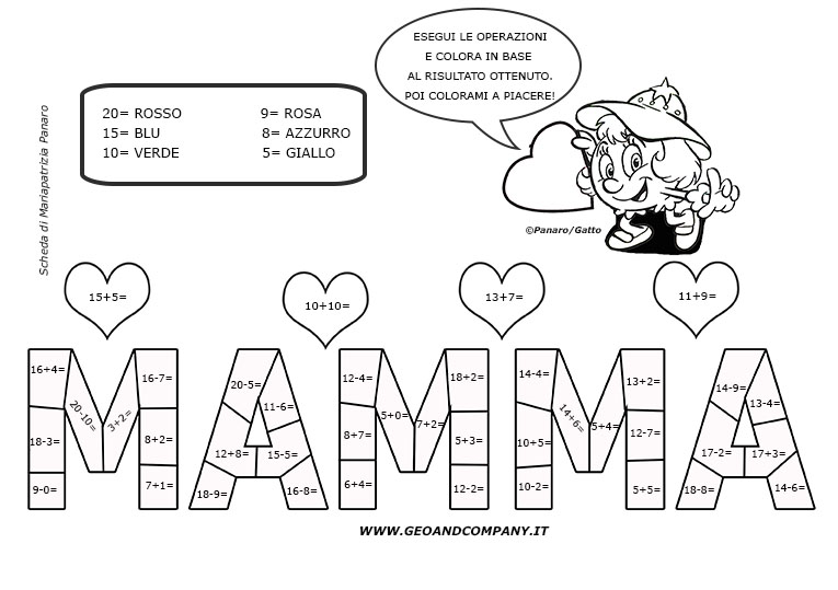 In occasione della Festa della Mamma, abbiamo pensato di realizzare una scheda della serie “calcola e colora”, tanto amata dai bambini. Ecco quindi: Calcola e colora – Mamma. La parola MAMMA è scritta in grandi lettere maiuscole, ognuna della quali è divisa in varie sezioni. Ogni sezione contiene un’operazione (addizione o sottrazione) entro il 20: i […]